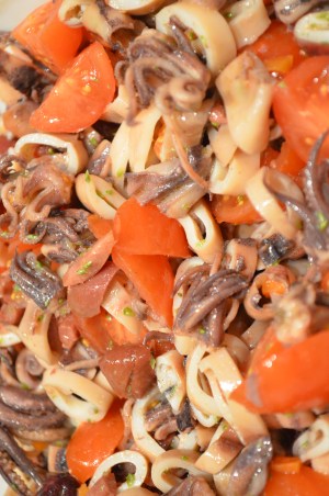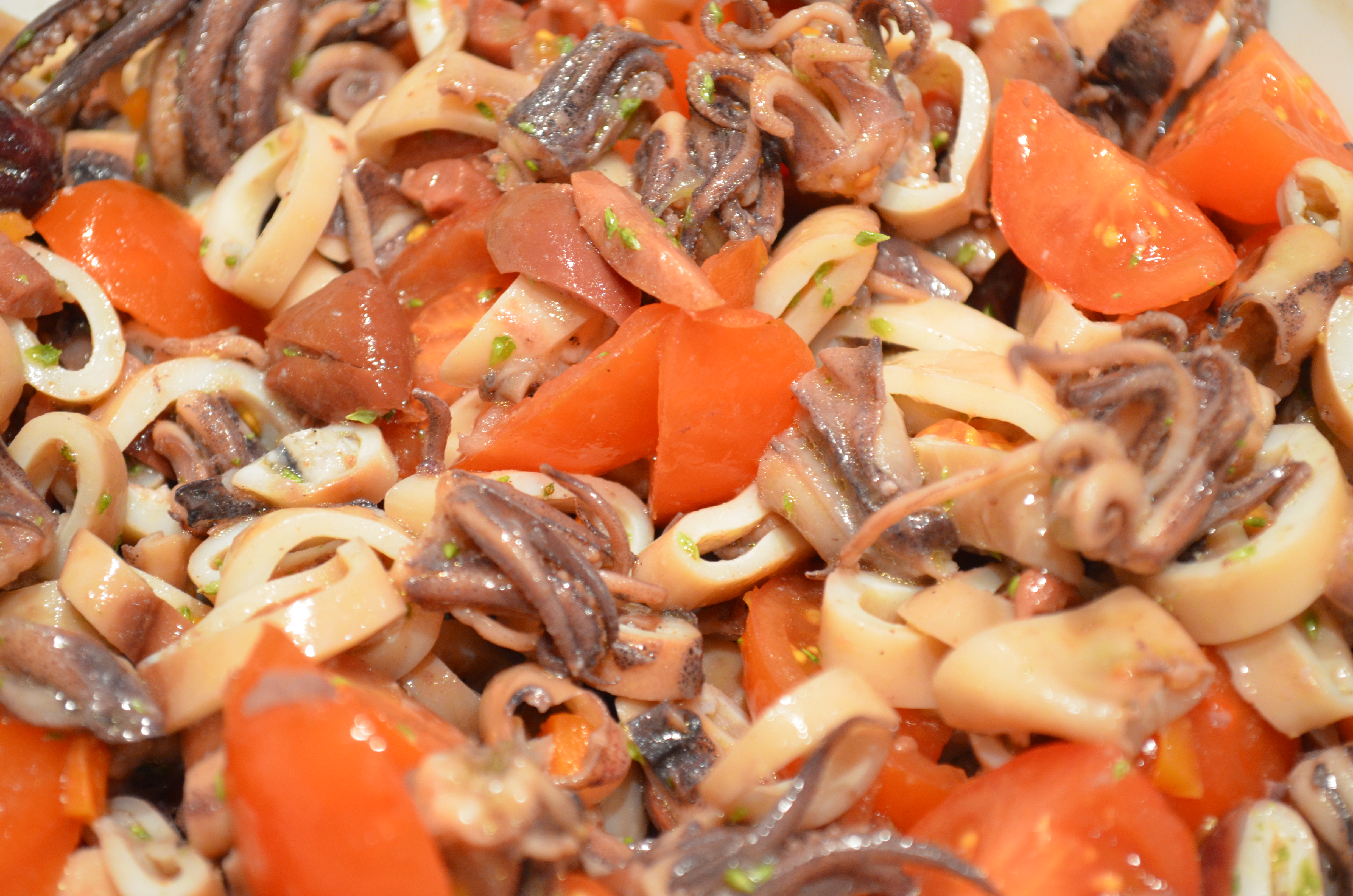 - In una terrina, mescolate i calamaretti, i pomodori , le olive con due pizzichi di origano