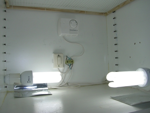 Montate i 2 portalampade sui fianchi come nella foto (1 sul fondo sx e 1 verso il fronte dx) . Non troppo in basso e no troppo vicini al fondo o allo sportello (quando chisuo). Per sicurezza è fondamentale’ e molto importante che con le lampadine accese non scaldino il legno.  Io ho fatto delle prove lasciando anche 1 ora le lampade accese e solo dopo aver visto la posizione che non scaldava minimamente il legno ho posizionato i protalampade.  Lasciate 3 cm d’aria tra la lampadina e la base, il fondo e lo sportello. Le due lampade vanno collegate al termostato (che funge da interrutore una volta in temperatura). In serie al termostato ho messo un interrutore che accende e spegne il lievitatore quando non è in uso. Fate uscire il cavo dal retro tramite un foro idoneo e collegate una normale spina 220V.