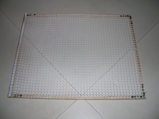 Con i 4 pezzetti di legno quadro assemblate la cornice rettangolare e ad esse legate la rete di plastica con delle fascette. Il telaio, sul quale stenderete un panno di lino umido, andrà interposto tra le lampade e le teglie. In questo modo l’aria calda salendo passerà attraverso il panno e umidificherà la cella. In realta ho notato che in alcuni casi è superfluo. Se infatti otterrete la chiusura stagna della cellettà è probabile che  l’umidità dell’impasto sia sufficiente a tenere la poca aria umida.